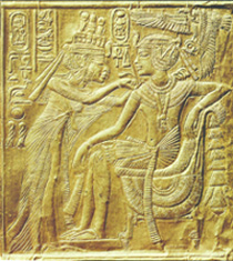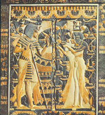 Tutanchamun auf einem Thron sitzt und Anchesenamun ihn liebevoll salbt. Andere Reliefs zeigen Tutanchamun und Anchesenamun bei der Jagd wie sie Tutanchamun einen Pfeil reicht. In allen Szenen ist die Zuneigung, die
